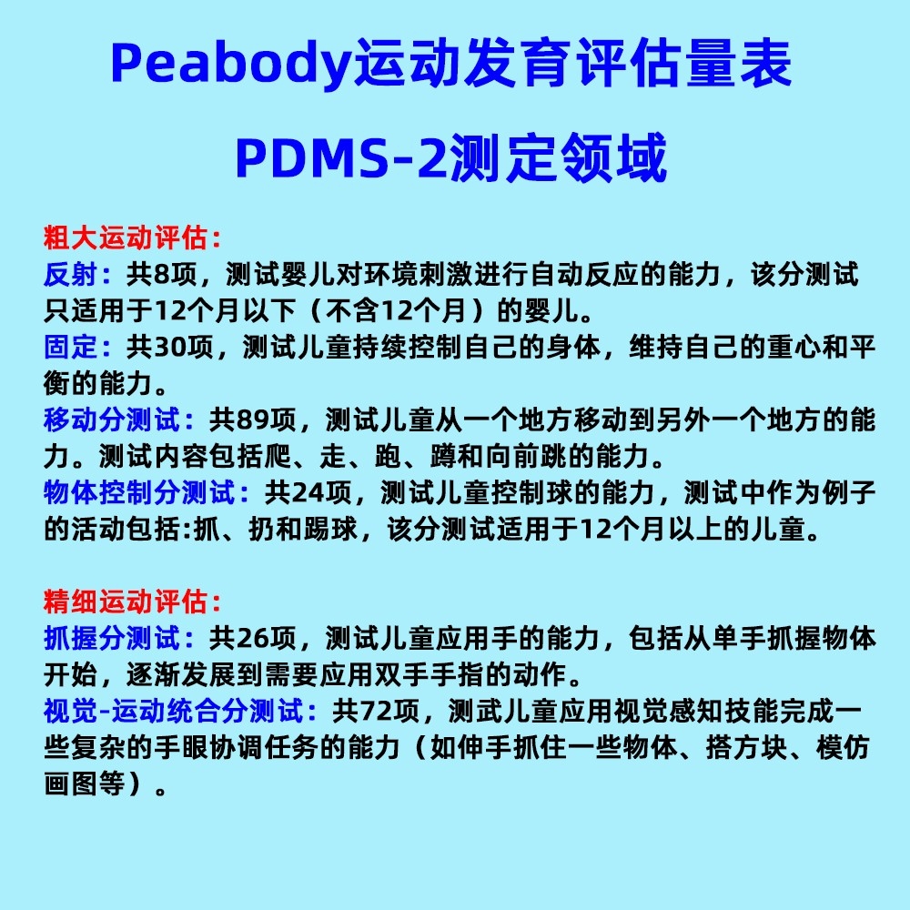 (1)測驗(yàn)范圍:適用于5個(gè)月-16歲兒童的運(yùn)動(dòng)能力。